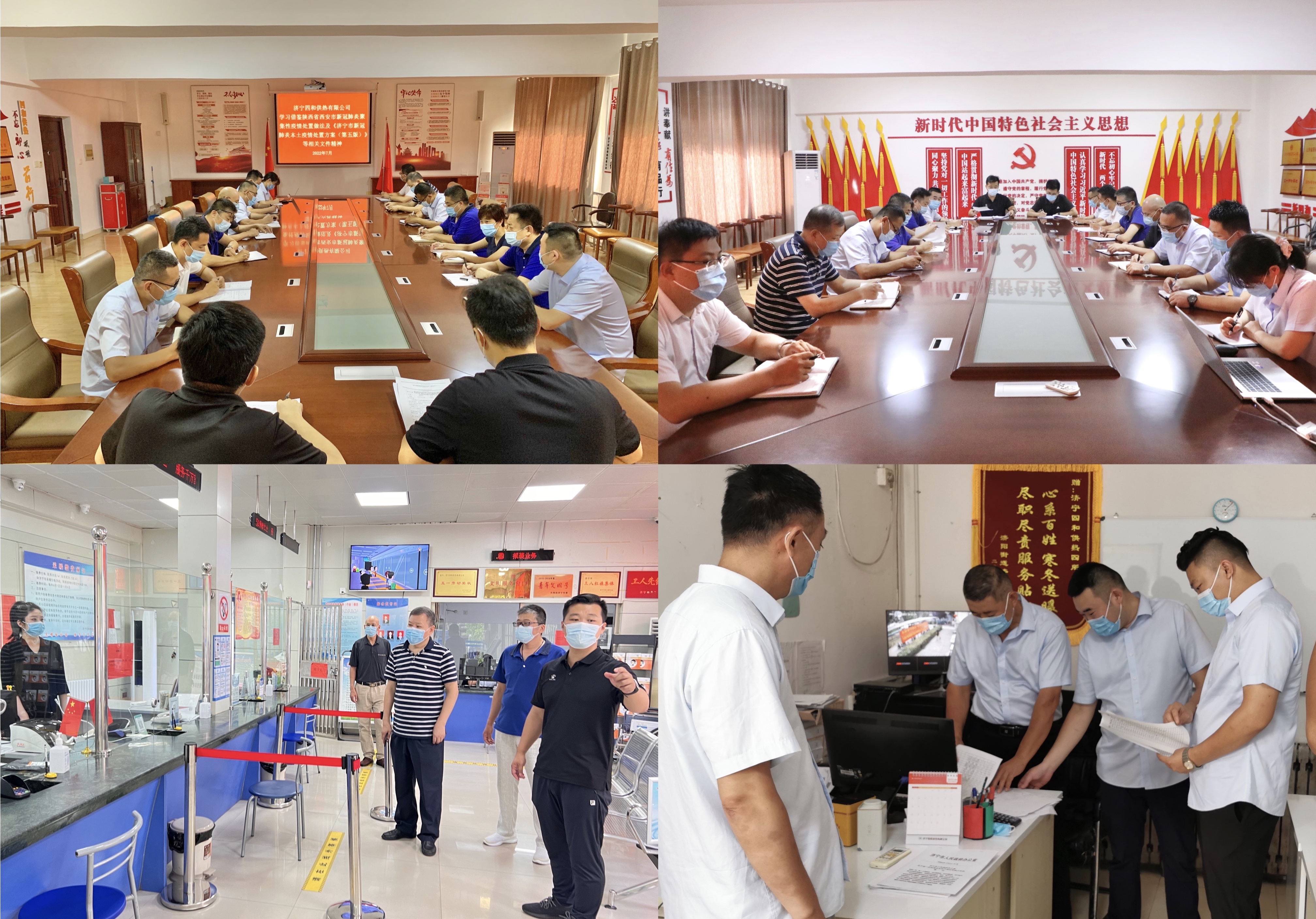 7月27日上午,公司領(lǐng)導(dǎo)及各科室負(fù)責(zé)人召開安全會議專題部署疫情防控工作。會議傳達(dá)并學(xué)習(xí)了《濟(jì)寧市新冠肺炎本土疫情處置方案(第五版)》等相關(guān)重要文件,對公司當(dāng)前形式的防疫工作和運(yùn)行管理上做出部署。會議結(jié)束后,四和供熱公司相關(guān)工作分管領(lǐng)導(dǎo)及科室負(fù)責(zé)人一行先后前往營業(yè)廳、各供熱所進(jìn)行疫情防控工作現(xiàn)場檢查,對疫情防控工作臺賬、防疫物資情況、外出人員登記情況、公共場所消殺記錄等進(jìn)行查閱,并聽取科室負(fù)責(zé)人及所長對疫情防控工作的匯報(bào)。